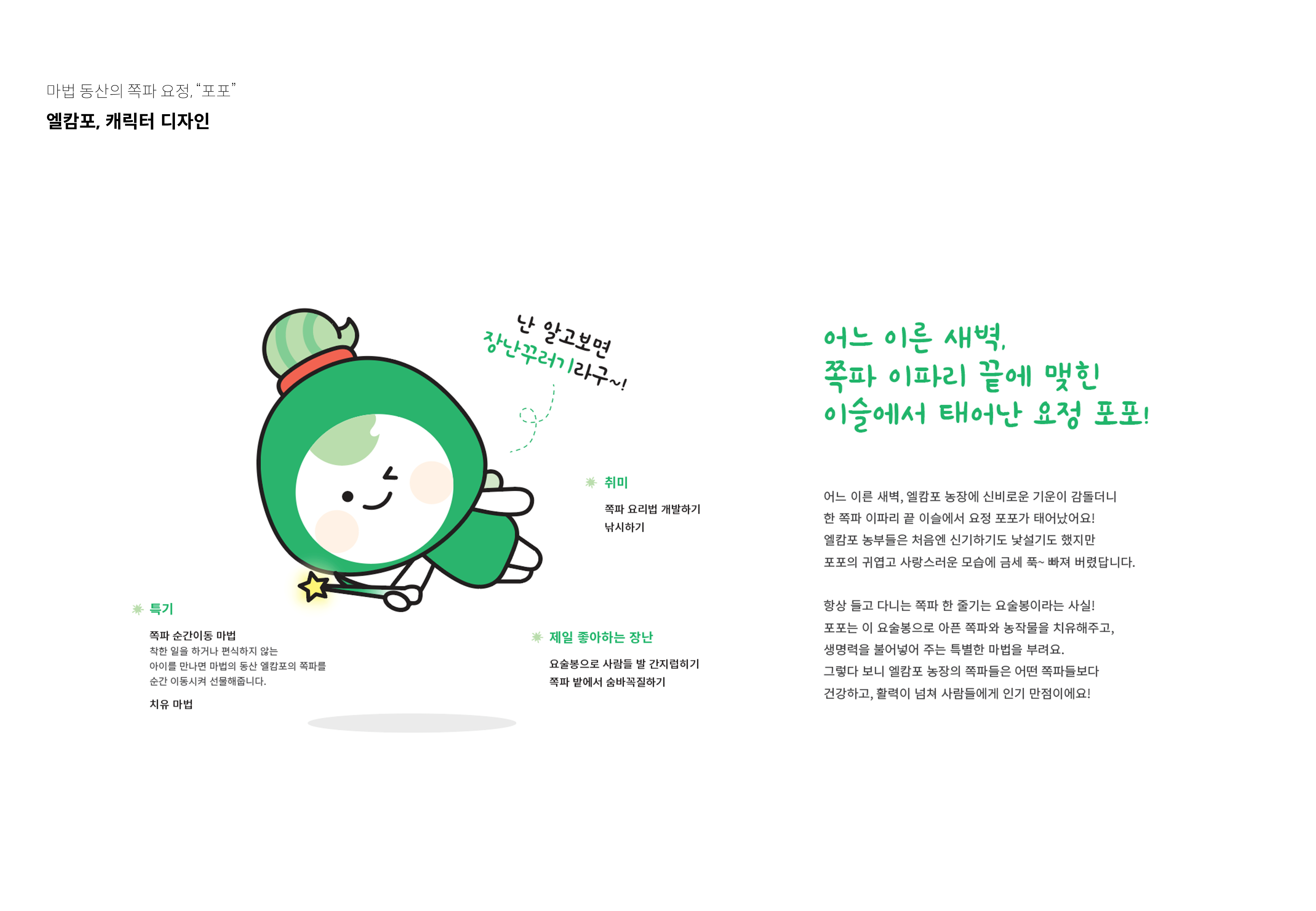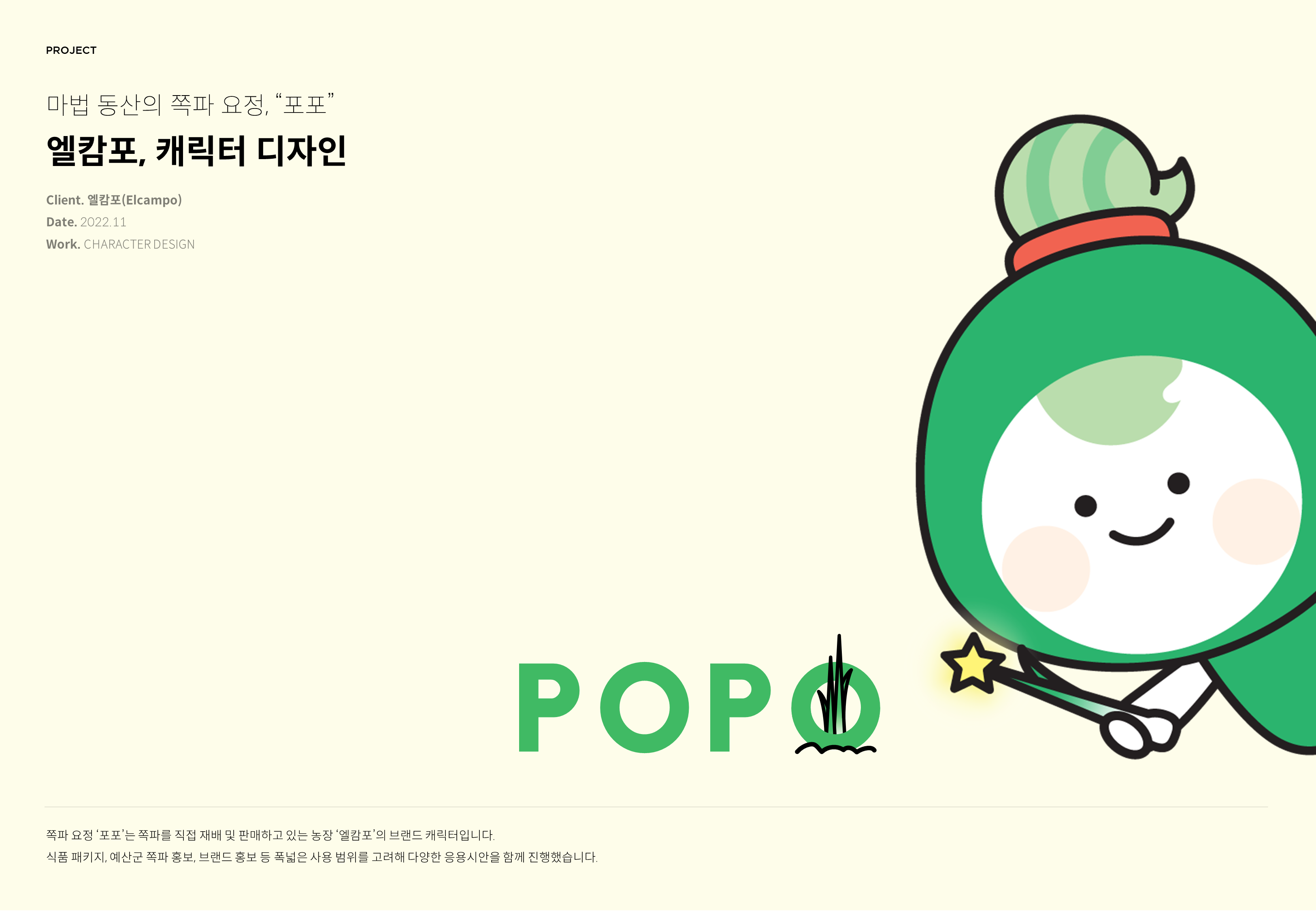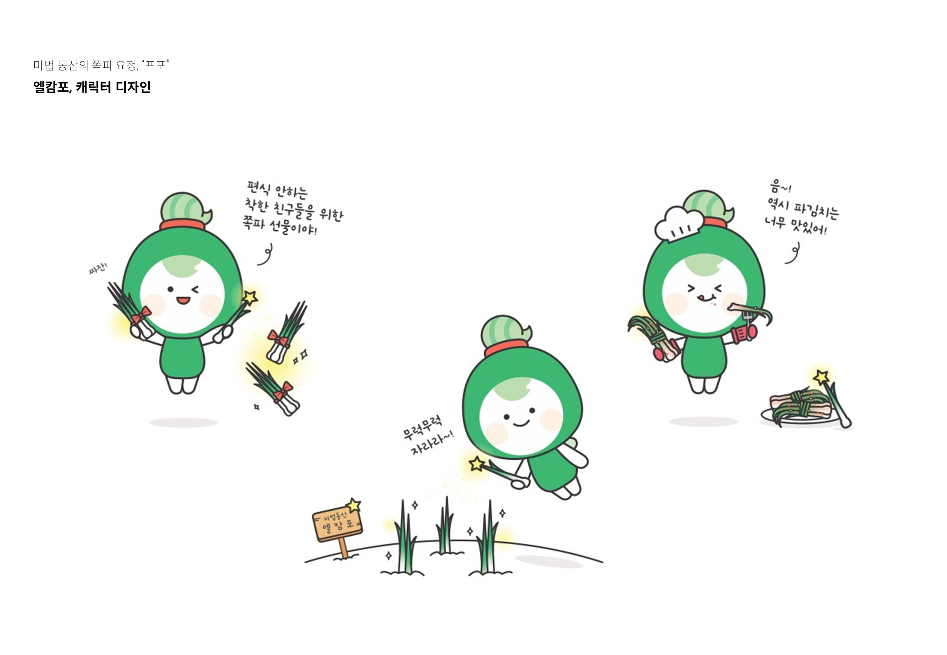 엘캄포 캐릭터 디자인 페이지 정보 작성자 최고관리자 댓글 0건 조회 30회 작성일 23-07-12 16:59 목록 본문 스크랩 마법 동산의 쪽파 요정, '포포' 쪽파 요청 '포포'는 쪽파를 직접 재배 및 판매하고 있는 농장 '엘캄포'의 브랜드 캐릭터입니다. 식품 패키지, 예산군 쪽파 홍보, 브랜드 홍보 등 폭넓은 사용 범위를 고려해 다양한 응용시안을 함께 진행했습니다. 추천2 이전글#4B4E65 25.11.17 다음글#3B3730 23.07.12