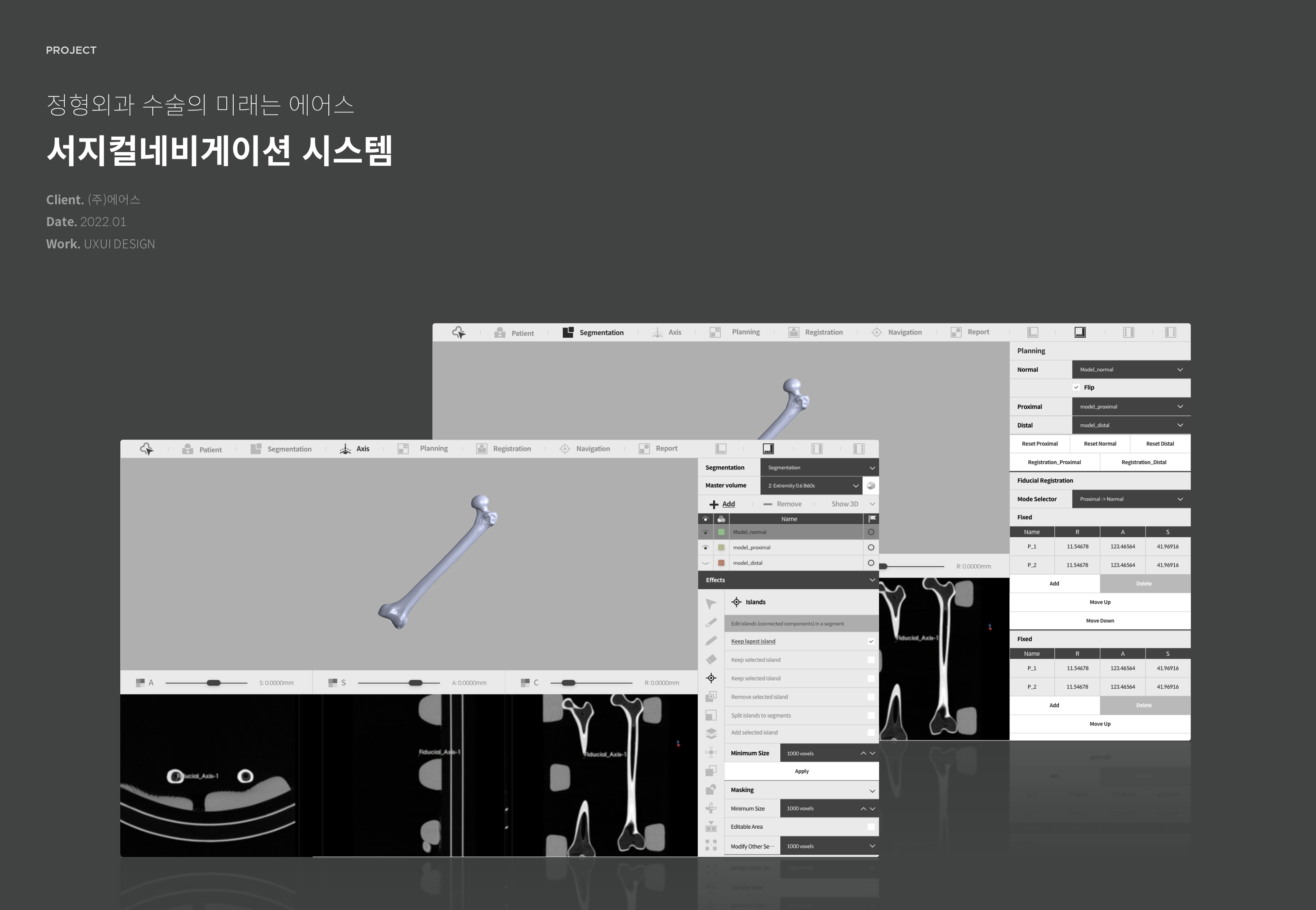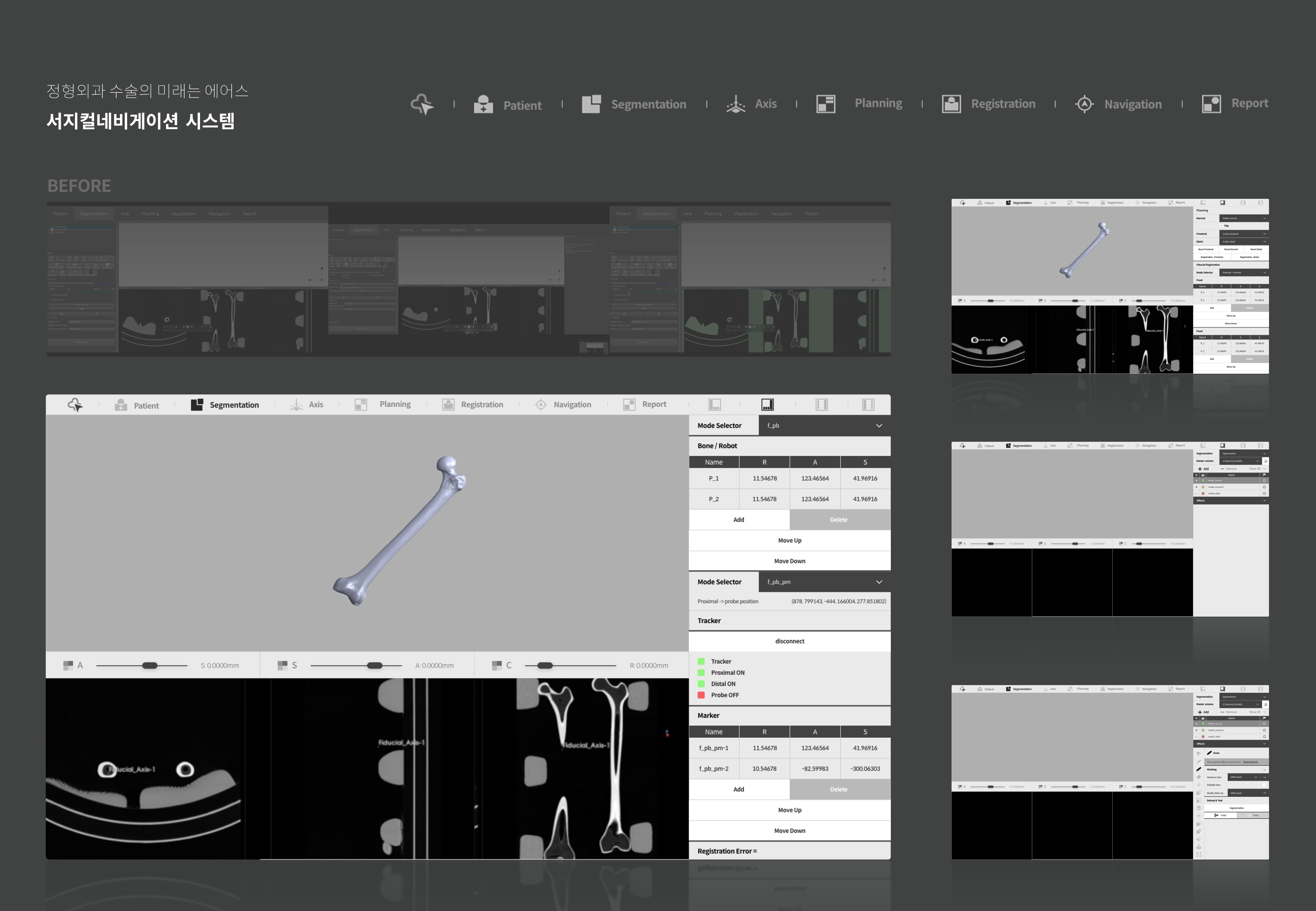 정형외과 수술의 미래는 에어스 에어스의 서지컬네비게이션은 기존 골절 수술 방식의 문제점을 고려하여 방사선 촬영을 최소화 하면서 단시간 내에 최소 침습 수술이 가능한 초정밀 모듈형 시스템으로 기존의 사용성과 시인성을 개선하여 리뉴얼 하였습니다.
