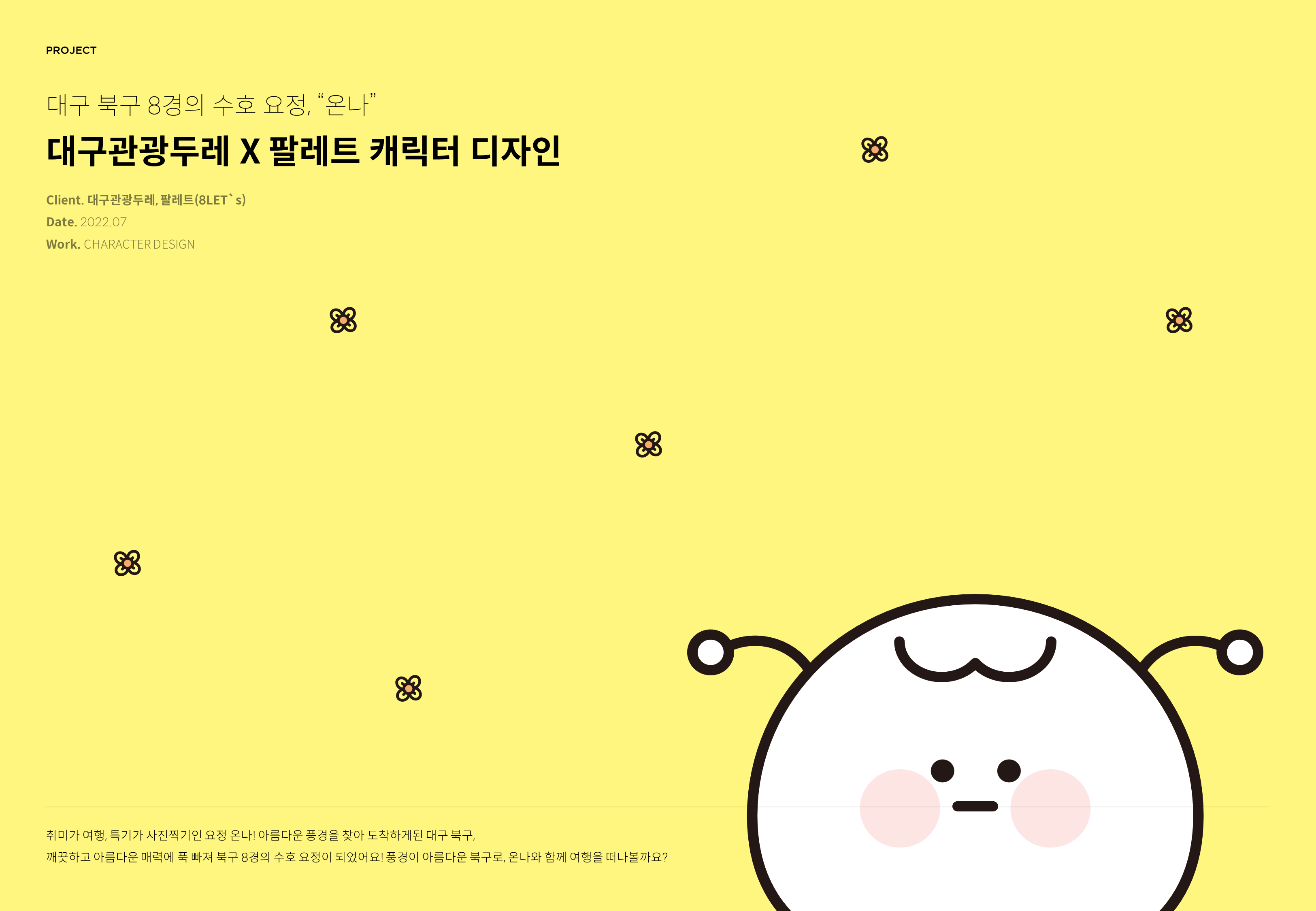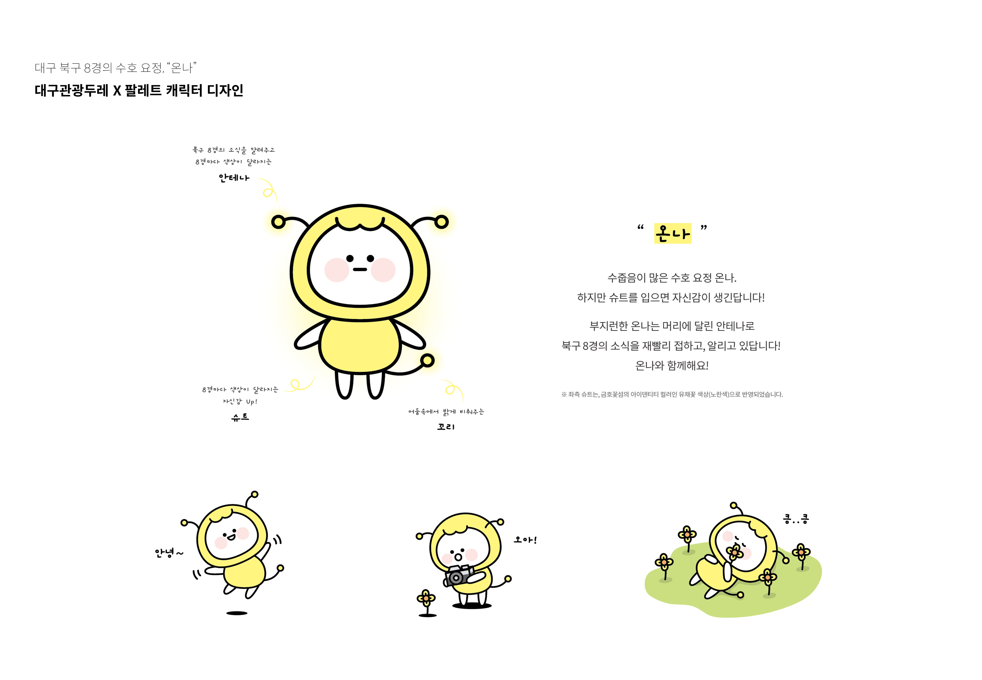 대구관광두레 X 팔레트 캐릭터 디자인 페이지 정보 작성자 최고관리자 댓글 0건 조회 38회 작성일 22-08-04 11:57 목록 본문 스크랩 대구 북구 8경의 수호요정 "온나" 취미가 여행, 특기가 사진찍기인 요정 온나! 아름다운 풍경을 찾아 도착하게된 대구 북구, 깨끗하고 아름다운 매력에 푹 빠져 북구 8경의 수호 요정이 되었어요! 풍경이 아름다운 북구로, 온나와 함께 여행을 떠나볼까요? 추천1 이전글#009A6B 22.08.04 다음글#3F3F3F 22.05.12