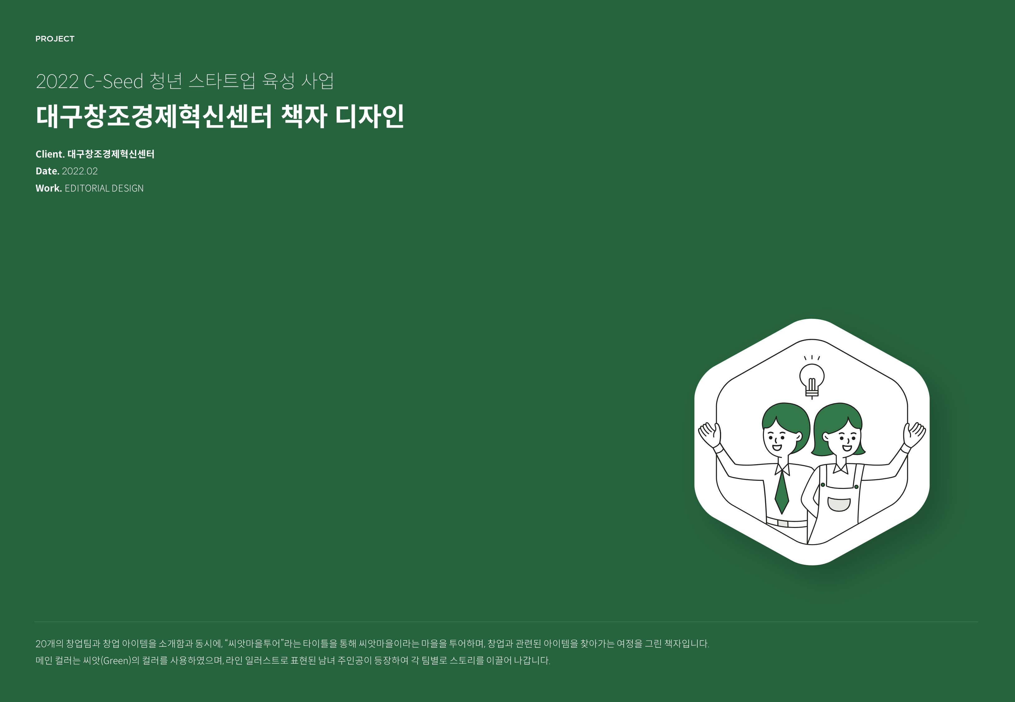 대구창조경제혁신센터 책자 페이지 정보 작성자 최고관리자 댓글 0건 조회 33회 작성일 22-08-04 13:16 목록 본문 스크랩 소셜벤처 360 가이드북 단계별 체크리스트를 통한 자기진단이 포함되어 있어, 창업을 시작하는 분들에게 가이드북으로써 역할을 해내고 있다. 무채색을 기반으로 심플하게 접근하되, 포인트 컬러로는 'orange(체크-주의)'를 사용하였다. 추천16 이전글#FAF5EC 22.08.04 다음글#009A6B 22.08.04