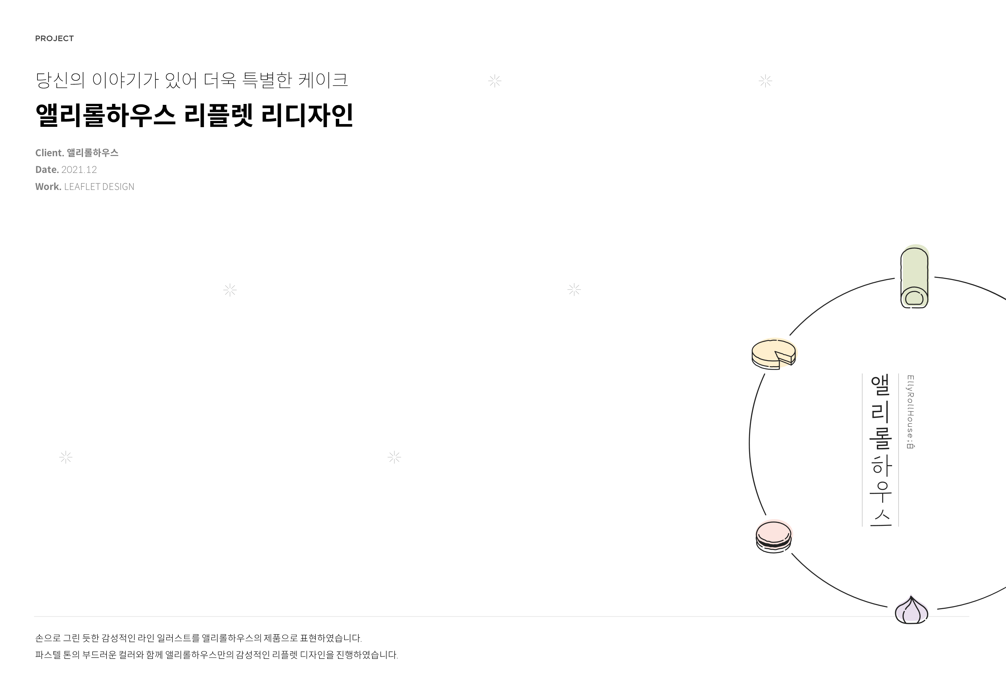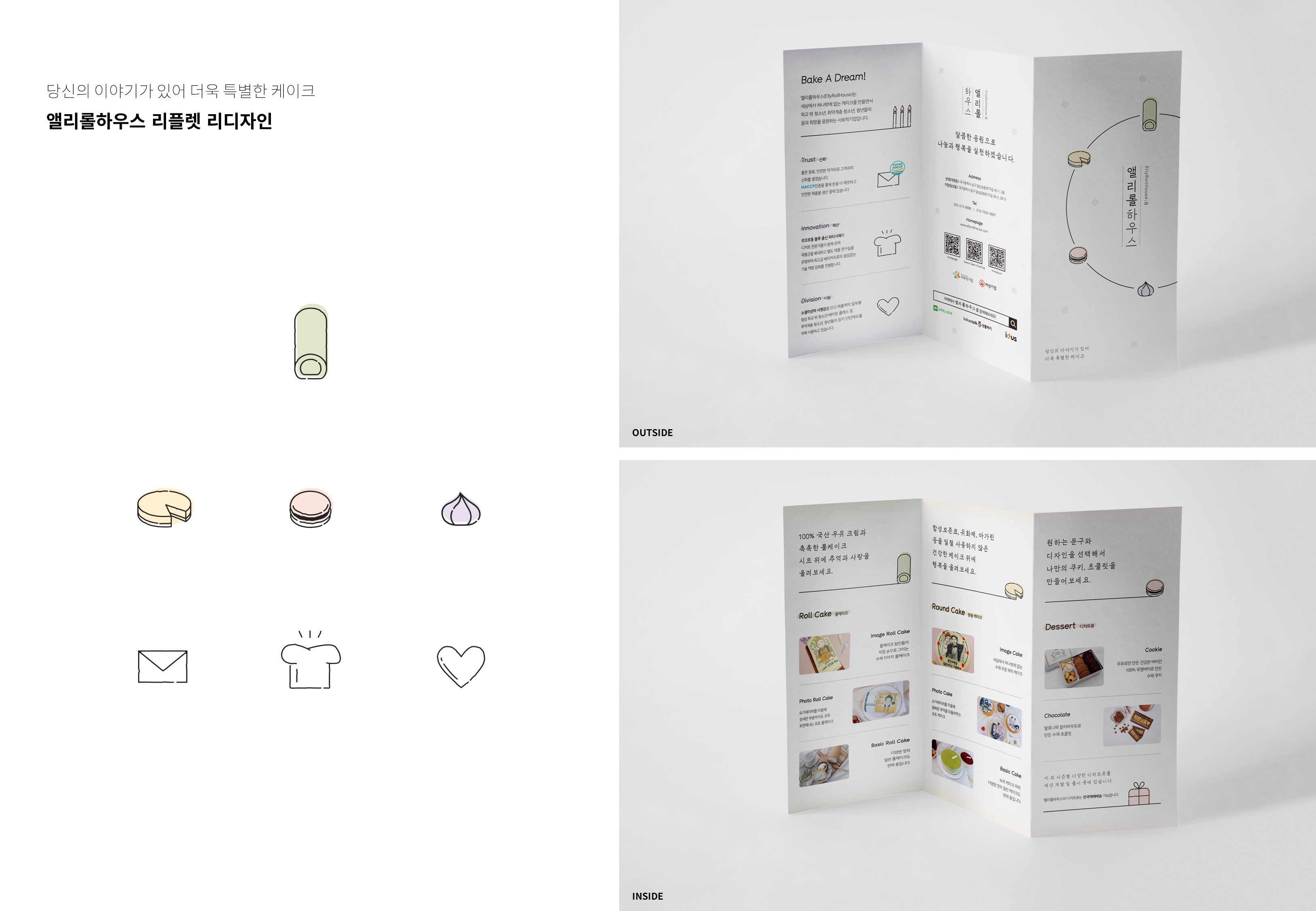 앨리롤하우스 리플렛 리디자인 페이지 정보 작성자 최고관리자 댓글 0건 조회 52회 작성일 22-08-04 13:19 목록 본문 스크랩 당신의 이야기가 있어 더욱 특별한 케이크 손으로 그린 듯한 감성적인 라인 일러스트를 앨리롤하우스의 제품으로 표현하였습니다. 파스텔 톤의 부드러운 컬러와 함께 앨리롤하우스만의 감성적인 리플렛 디자인을 진행하였습니다. 추천14 이전글#E4E5D9 22.08.04 다음글#ffffff 22.08.04