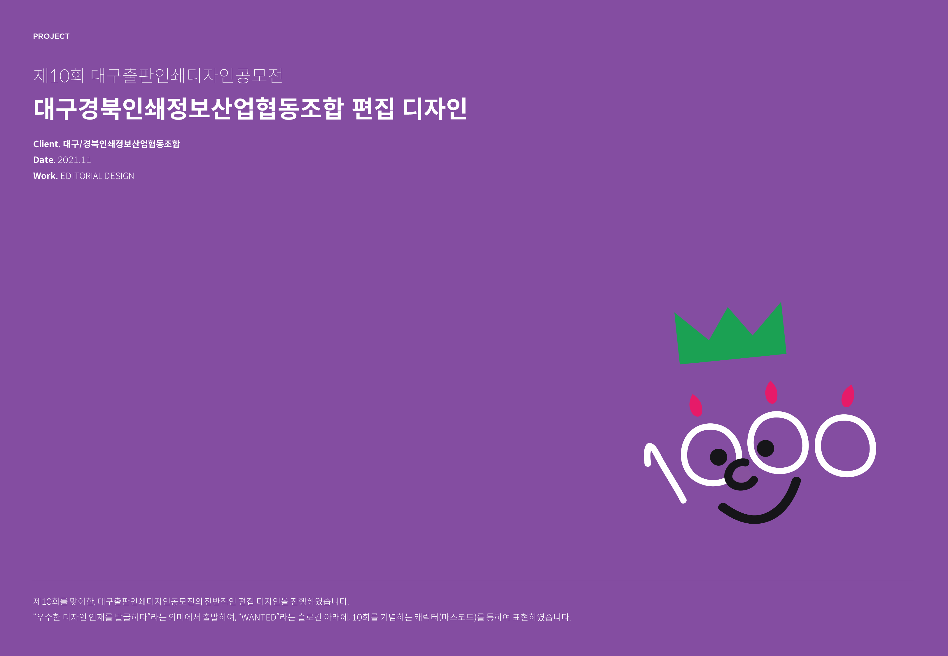 제10회를 맞이한, 대구출판인쇄디자인공모전의 전반적인 편집 디자인을 진행하였습니다.