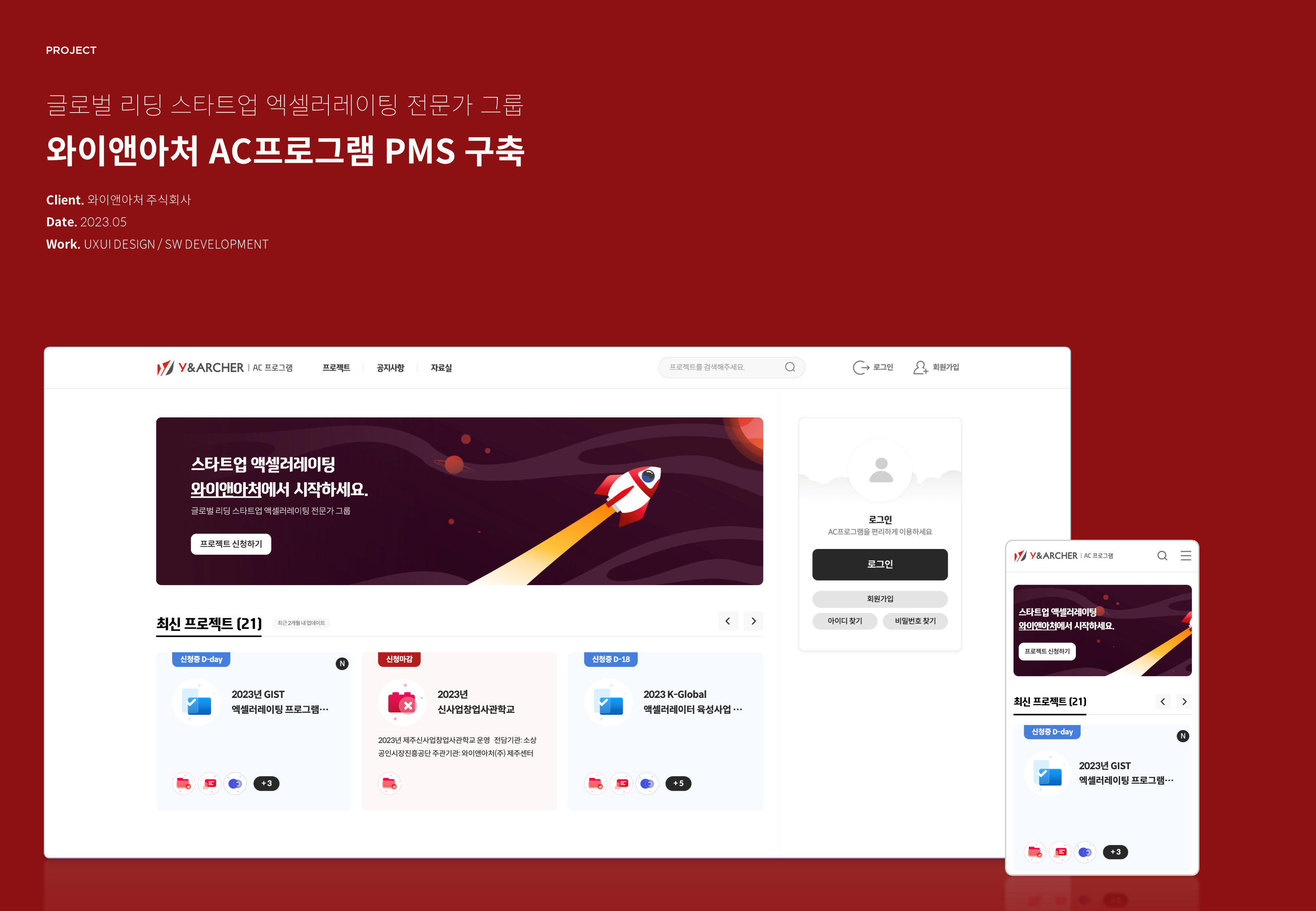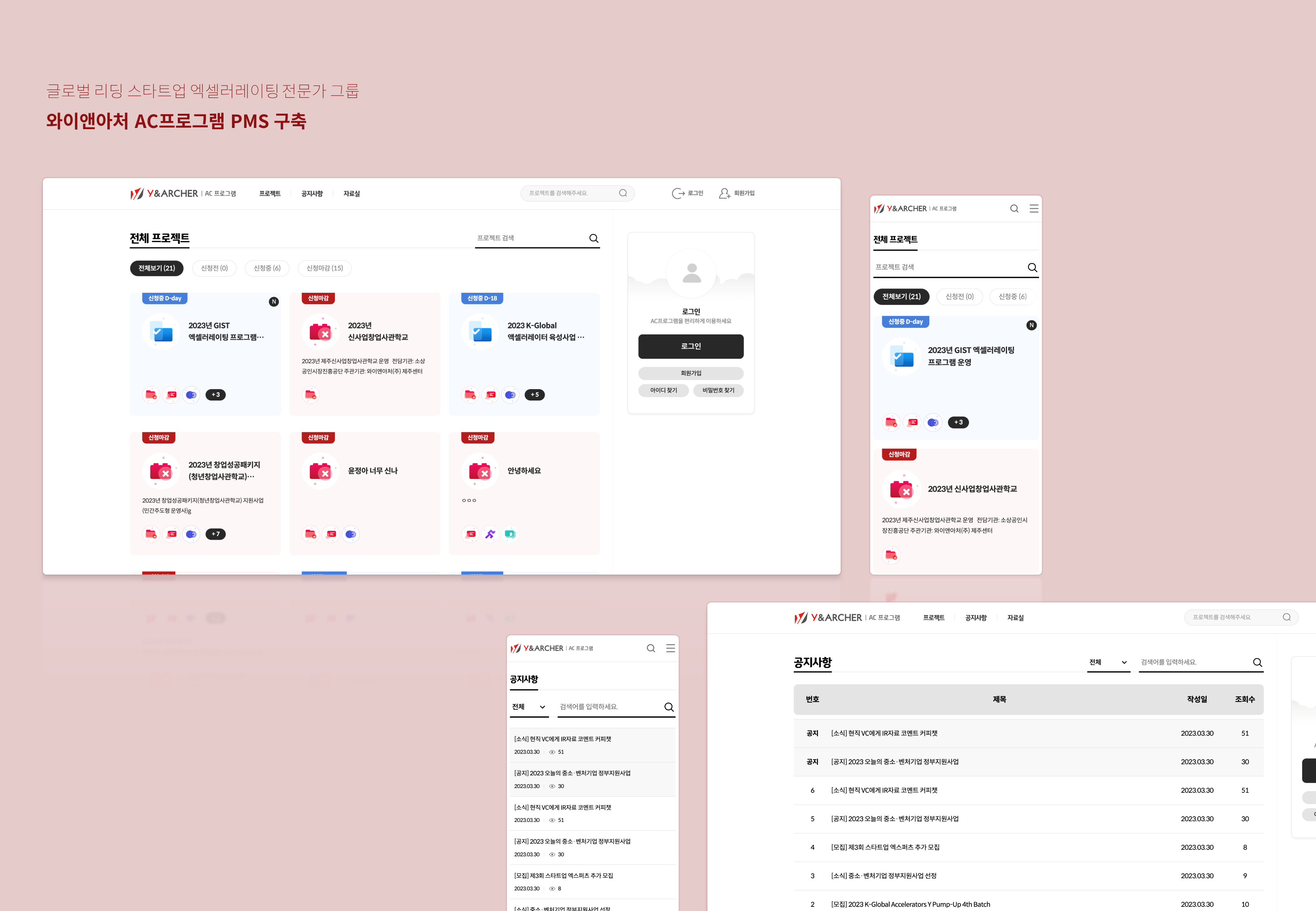 글로벌 리딩 스타트업 액셀러레이팅 전문가 그룹인 와이앤아처의 PMS 홈페이지는