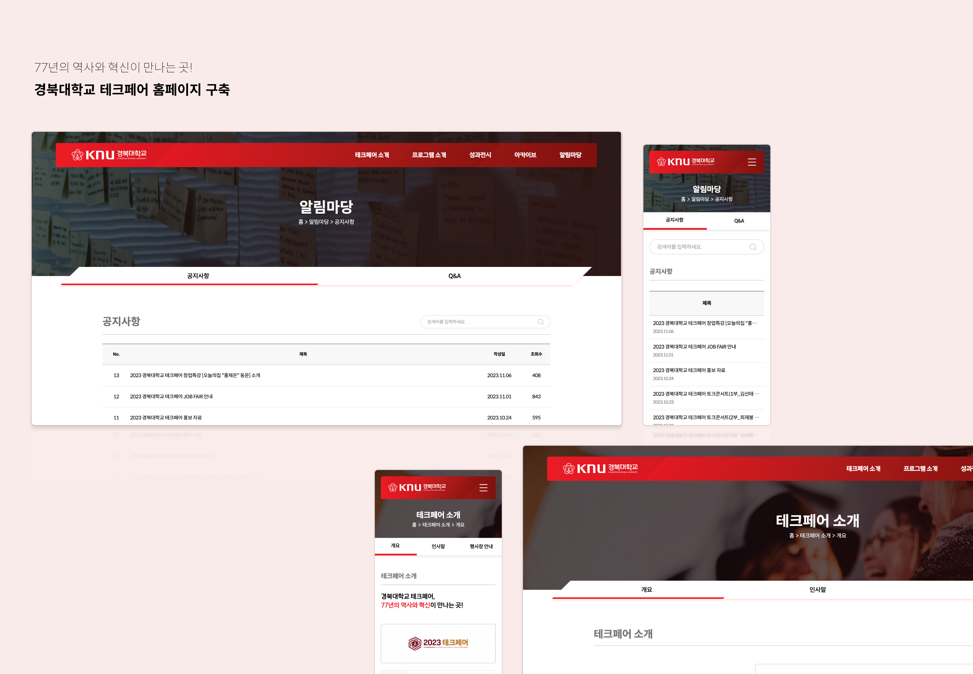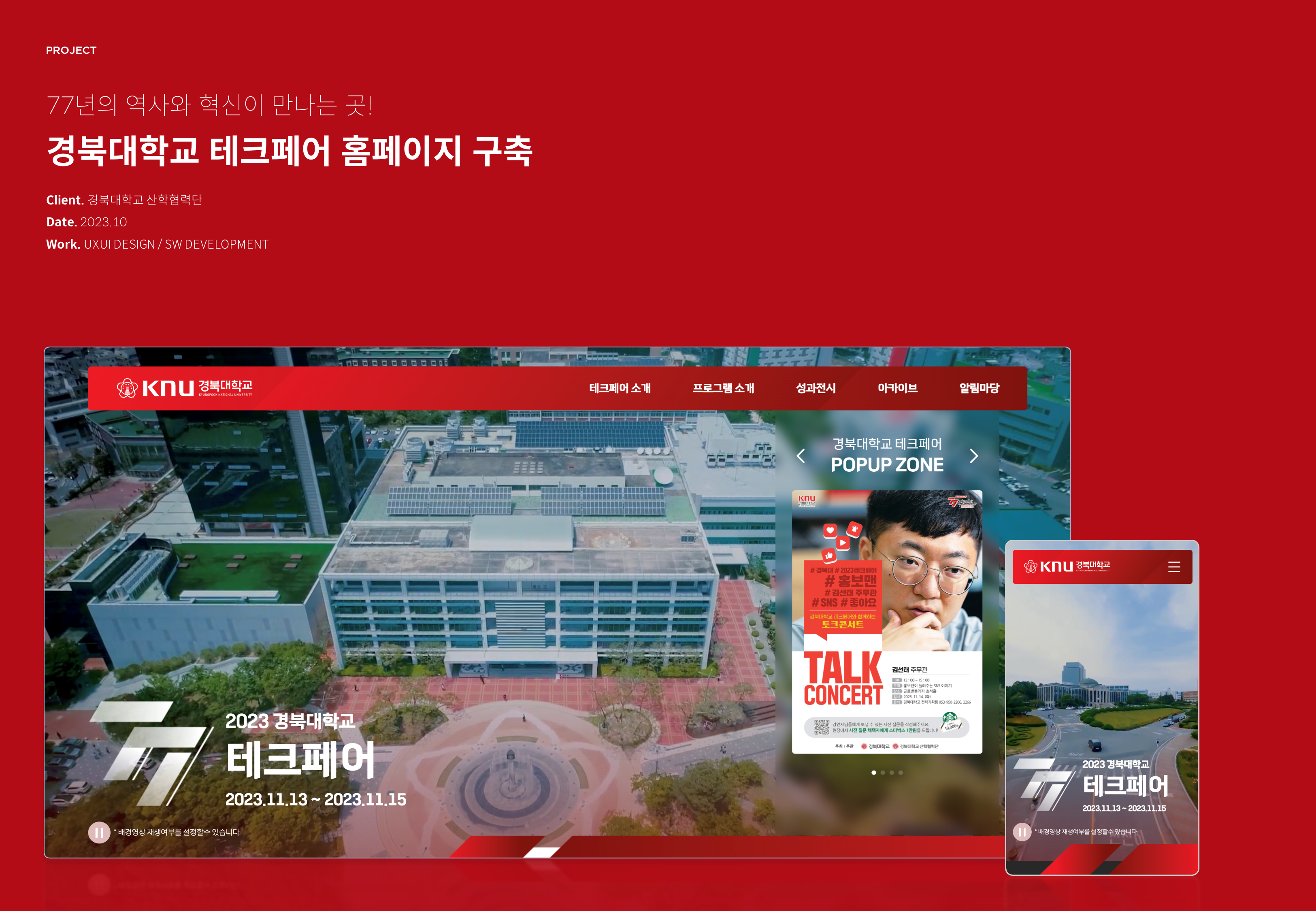 77년의 역사와 혁신이 만나는 곳! 2023년 경북대학교 테크페어는 77년의 역사와 혁신이 만나는 곳이라는 슬로건으로 진행됩니다. 경북대학교 테크페어의 기록들을 모아 둘 수 있는 아카이브 메뉴도 구성되어있으며, 테크페어 소개와 프로그램 소개 등을 전달하고자 홈페이지를 구축하였습니다.