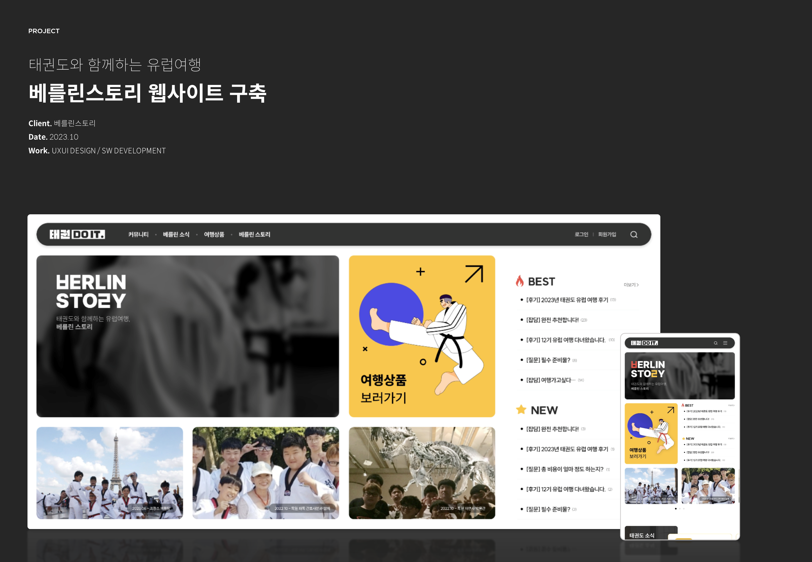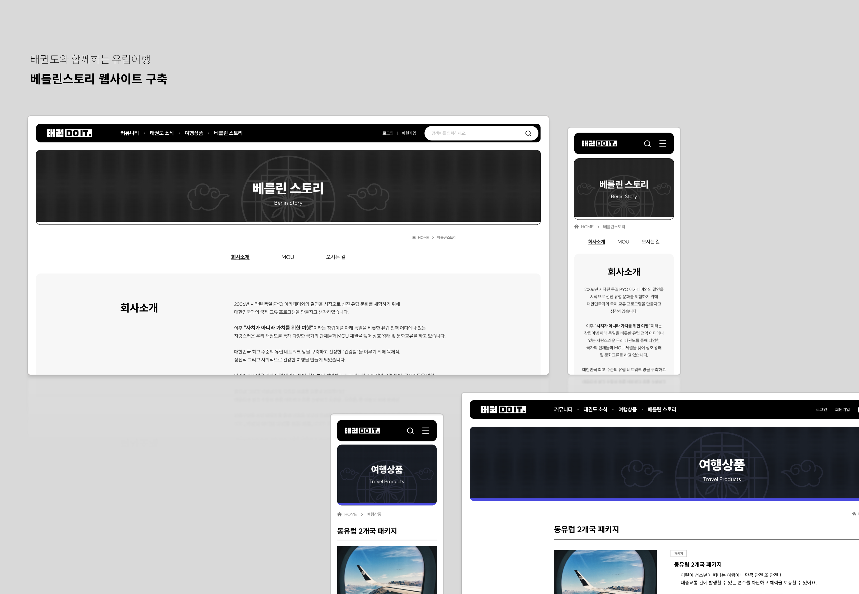 태권도와 함께하는 유럽여행 베를린 스토리는 어린이 청소년을 위한 유럽 태권도 투어, 학생부터 성인까지 참가 가능한 일반적인 유럽 투어, 골프인들을 위한 유럽 골프 투어, 편안한 휴양을 제공하는 유럽 실버 투어 등 다양한 특수목적 유럽 여행의 서비스를 제공하고 있습니다. 소개, 여행상품, 커뮤니티 등의 메뉴를 담은 홈페이지를 신규 구축하였습니다.