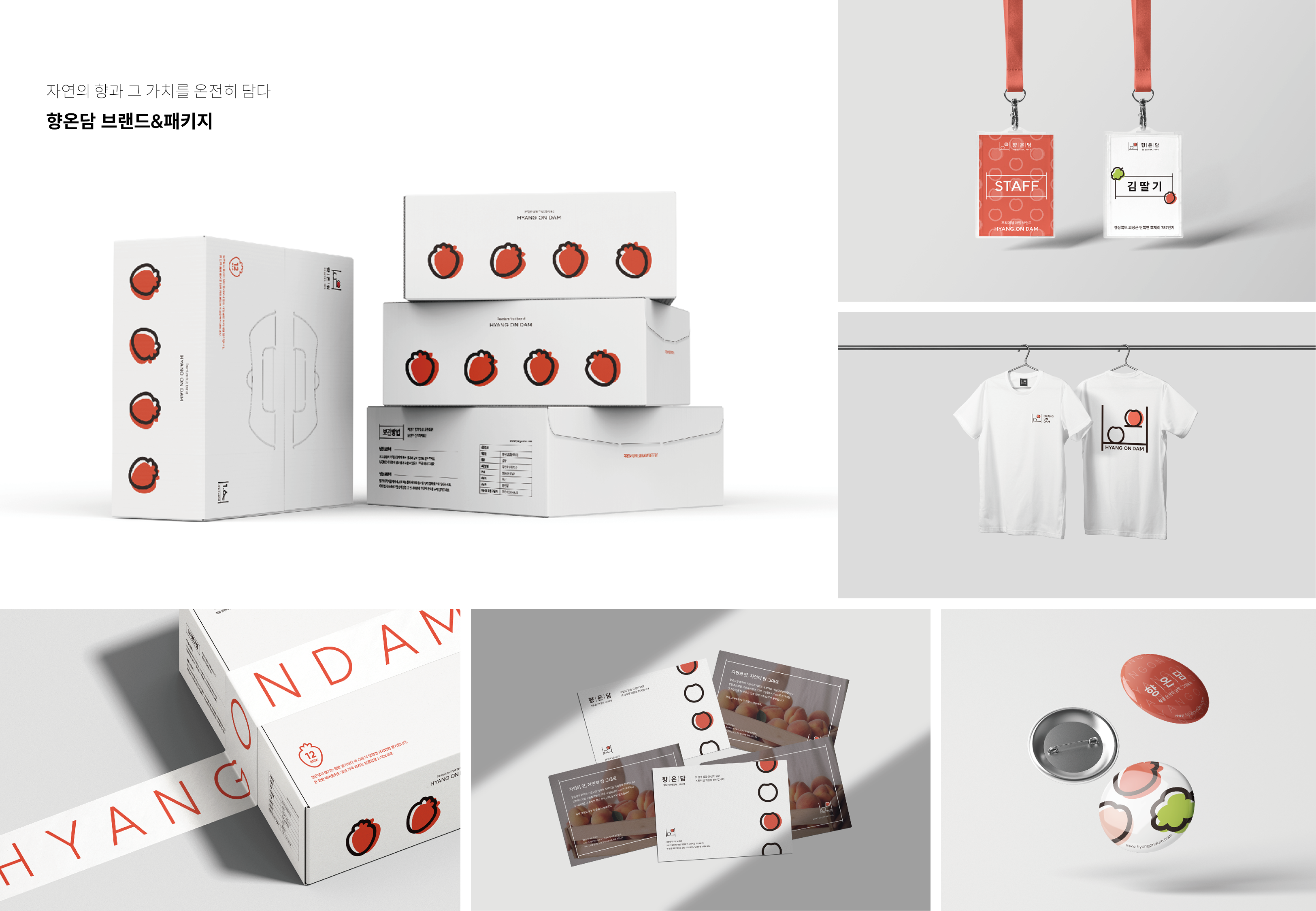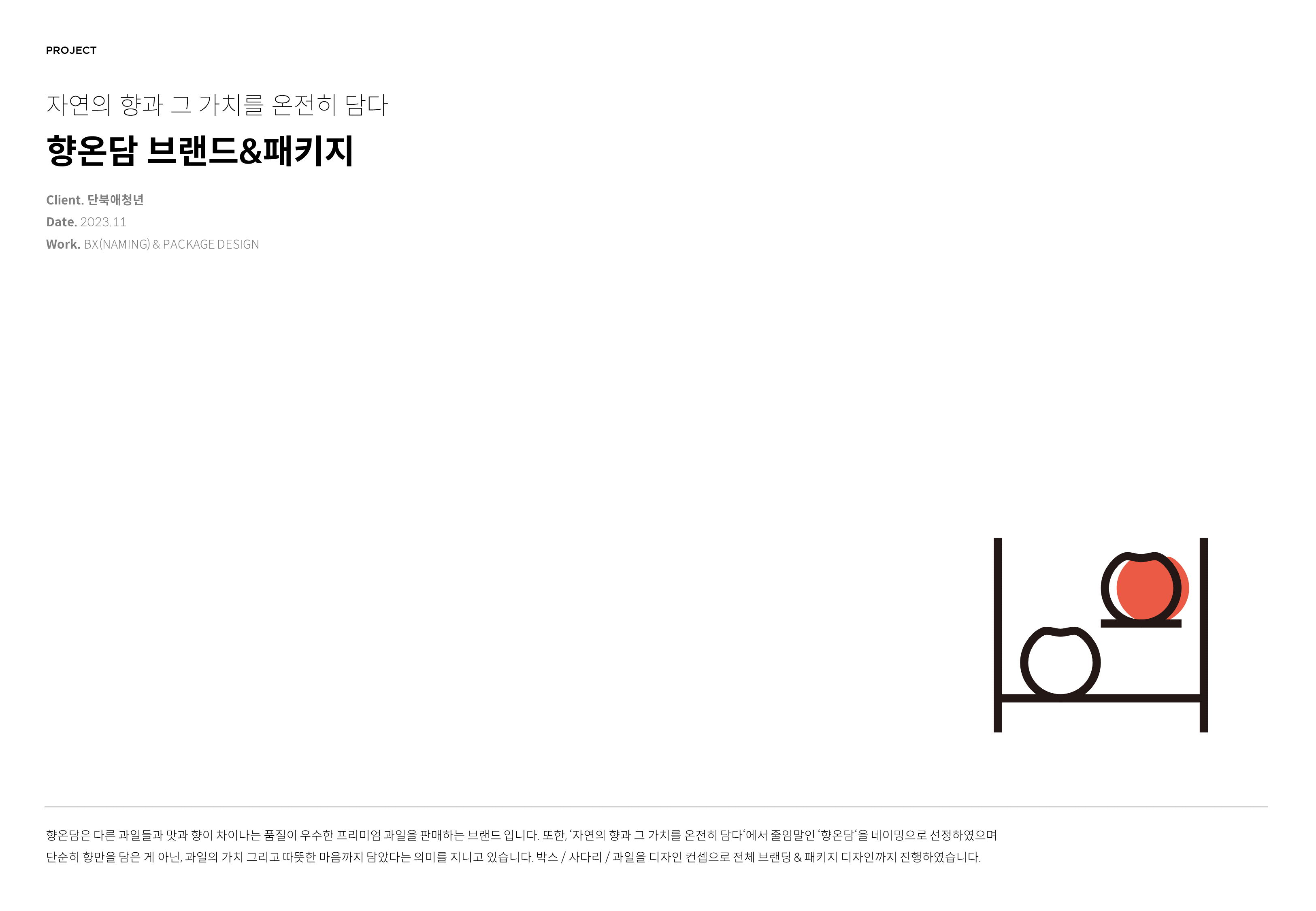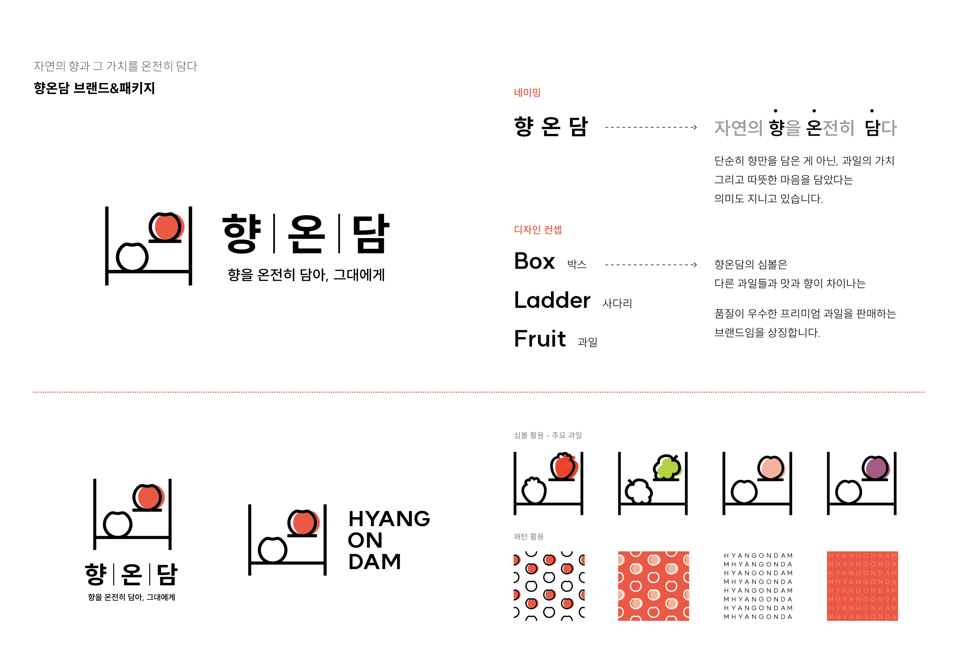 자연의 향과 그 가치를 온전히 담다 향온담은 다른 과일들과 맛과 향이 차이나는 품질이 우수한 프리미엄 과일을 판매하는 브랜드 입니다. 또한, '자연의 향과 그 가치를 온전히 담다'에서 줄임말인 '향온담'을 네이밍으로 선정하였으며 단순히 향만을 담은 게 아닌, 과일의 가치 그리고 따뜻한 마음까지 담았다는 의미를 지니고 있습니다. 박스/ 사다리 / 과일을 디자인 컨셉으로 전체 브랜딩 & 패키지 디자인까지 진행하였습니다.