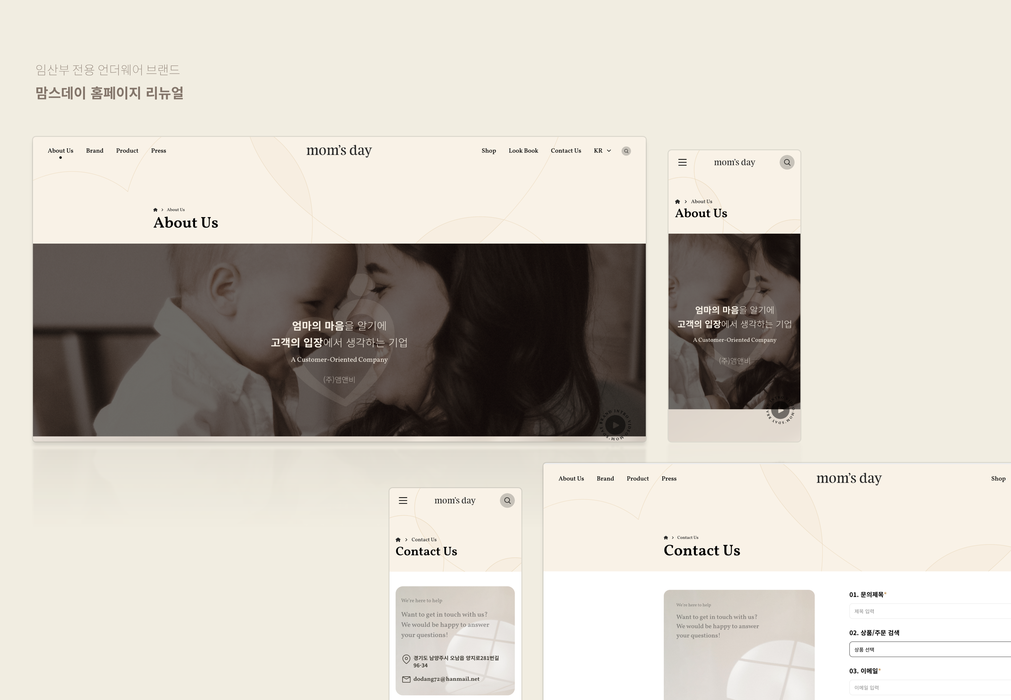 맘스데이의 아이덴티티를 반영하여 회사소개, 브랜드 소개, 제품소개 등의