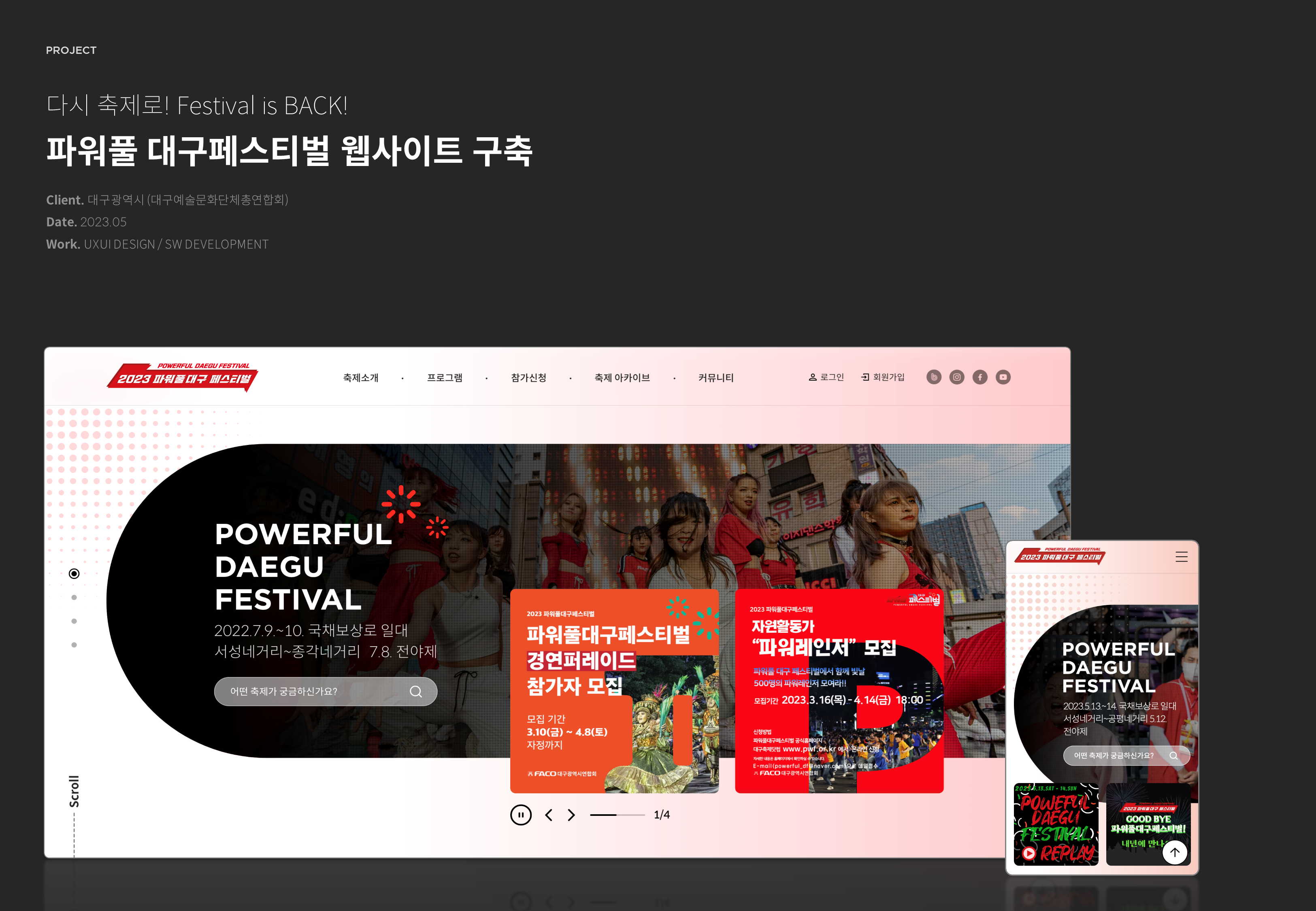다시 축제로! Festival is BACK! 파워풀 대구페스티벌은 기존의 축제 소개 사이트와 대구 축제 아카이브 사이트를 통합 및 리뉴얼한 사이트입니다. 파워풀 대구페스티벌 진행에 맞춰 오픈하였으며 메인은 와이드한 레이아웃과 이미지를 사용하였습니다. 또한 매년 축제 참가 신청 기간에 맞춰 신청폼은 오픈되며 참가자들이 직접 입력하여 축제 참가신청을 접수할 수 있습니다.
