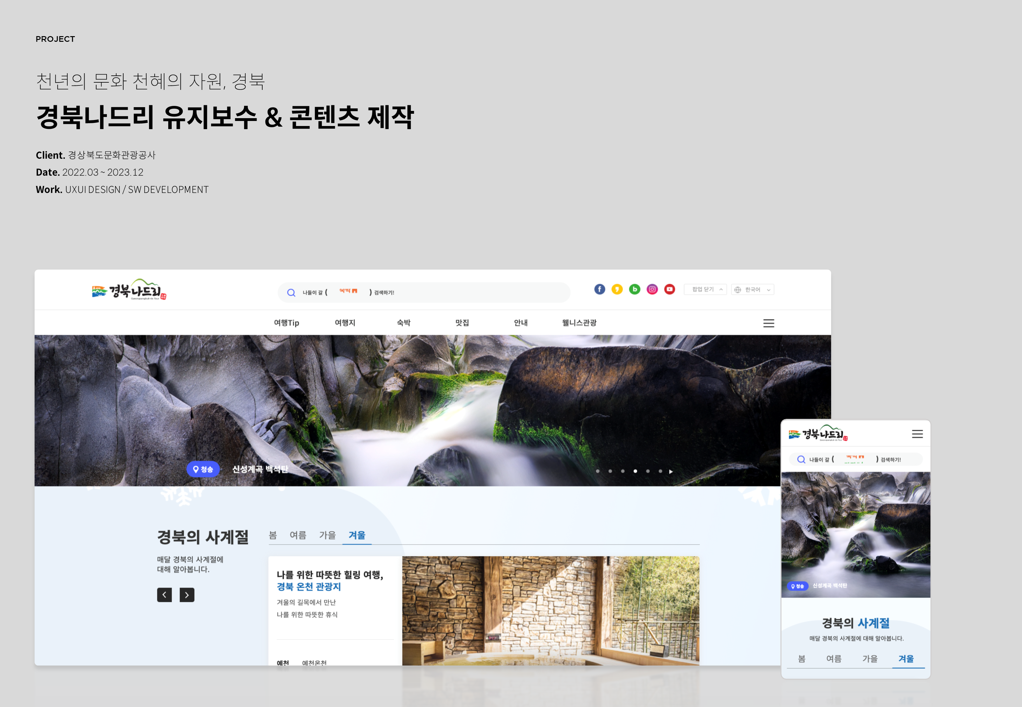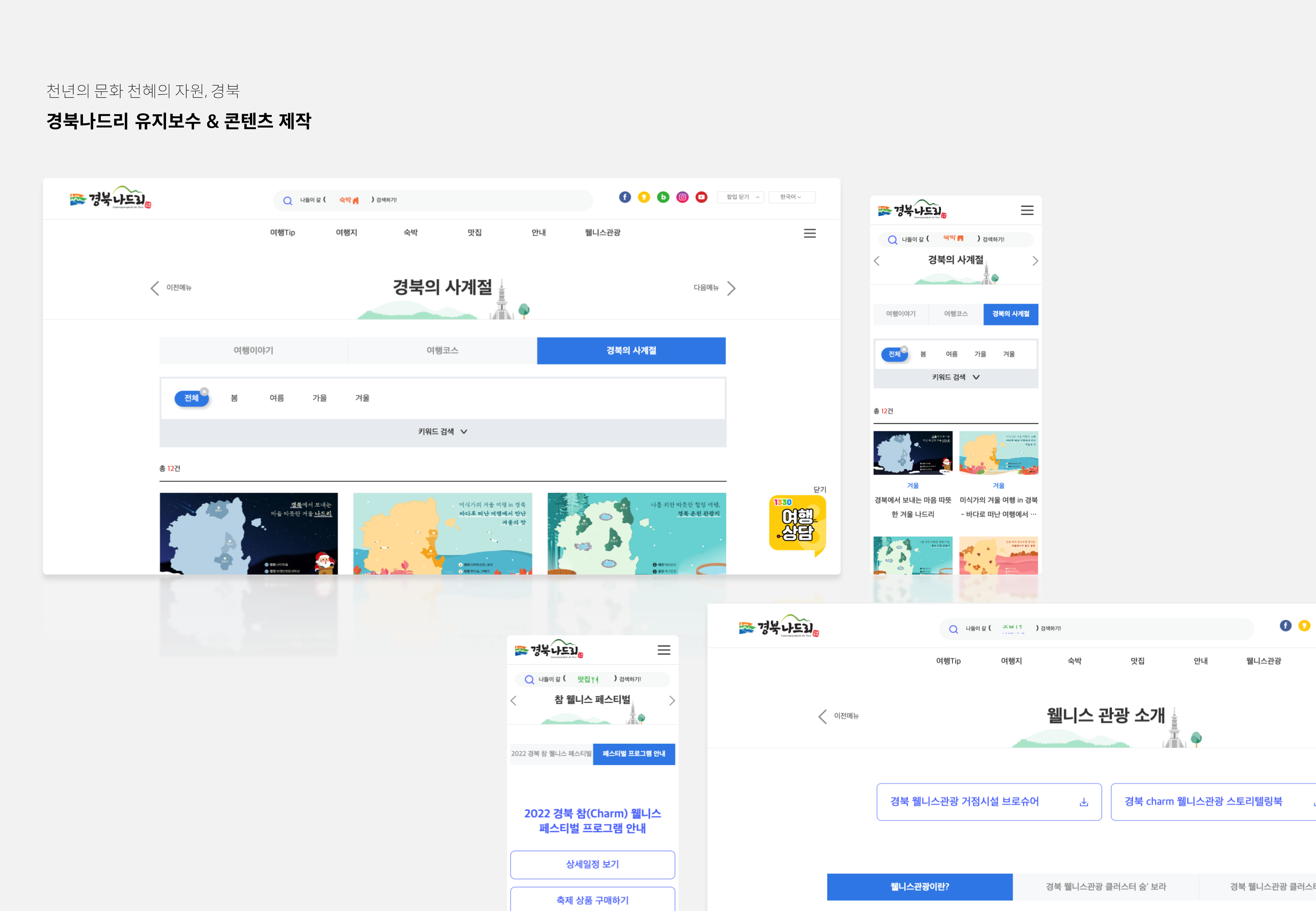 천년의 문화 천혜의 자원, 경북 경북나드리 웹사이트의 유지보수 및 콘텐츠 제작을 진행하고있습니다. 22.03 ~ 23.12