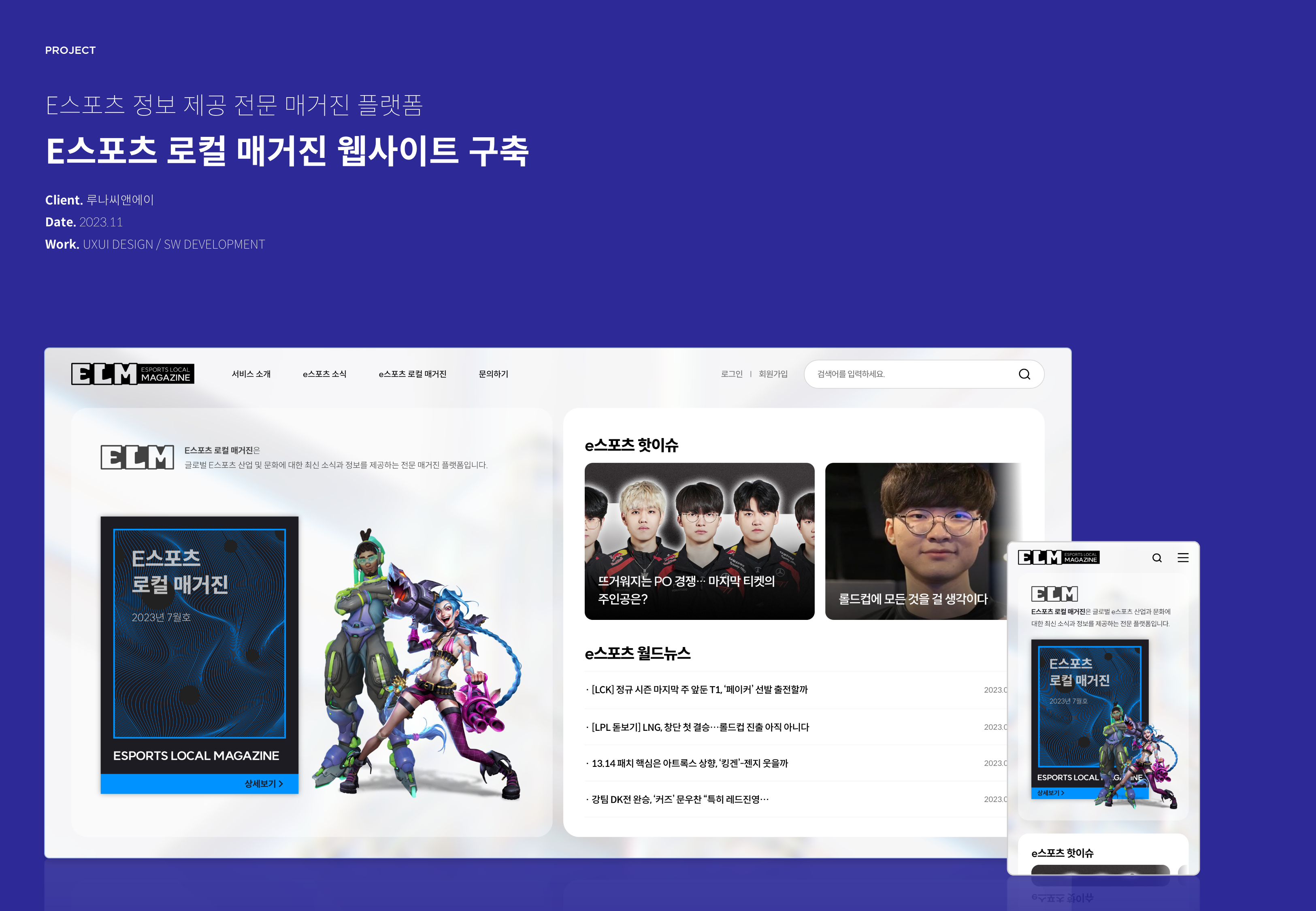 E스포츠 로컬 매거진 웹사이트 구축 페이지 정보 작성자 최고관리자 댓글 0건 조회 22회 작성일 25-11-14 15:34 목록 본문 스크랩 E스포츠 정보 제공 전문 매거진 플랫폼 E스포트 로컬 매거진 웹사이트를 구축하였습니다. 추천13 이전글#015CCE 25.11.14 다음글#CBD8EA 25.11.14