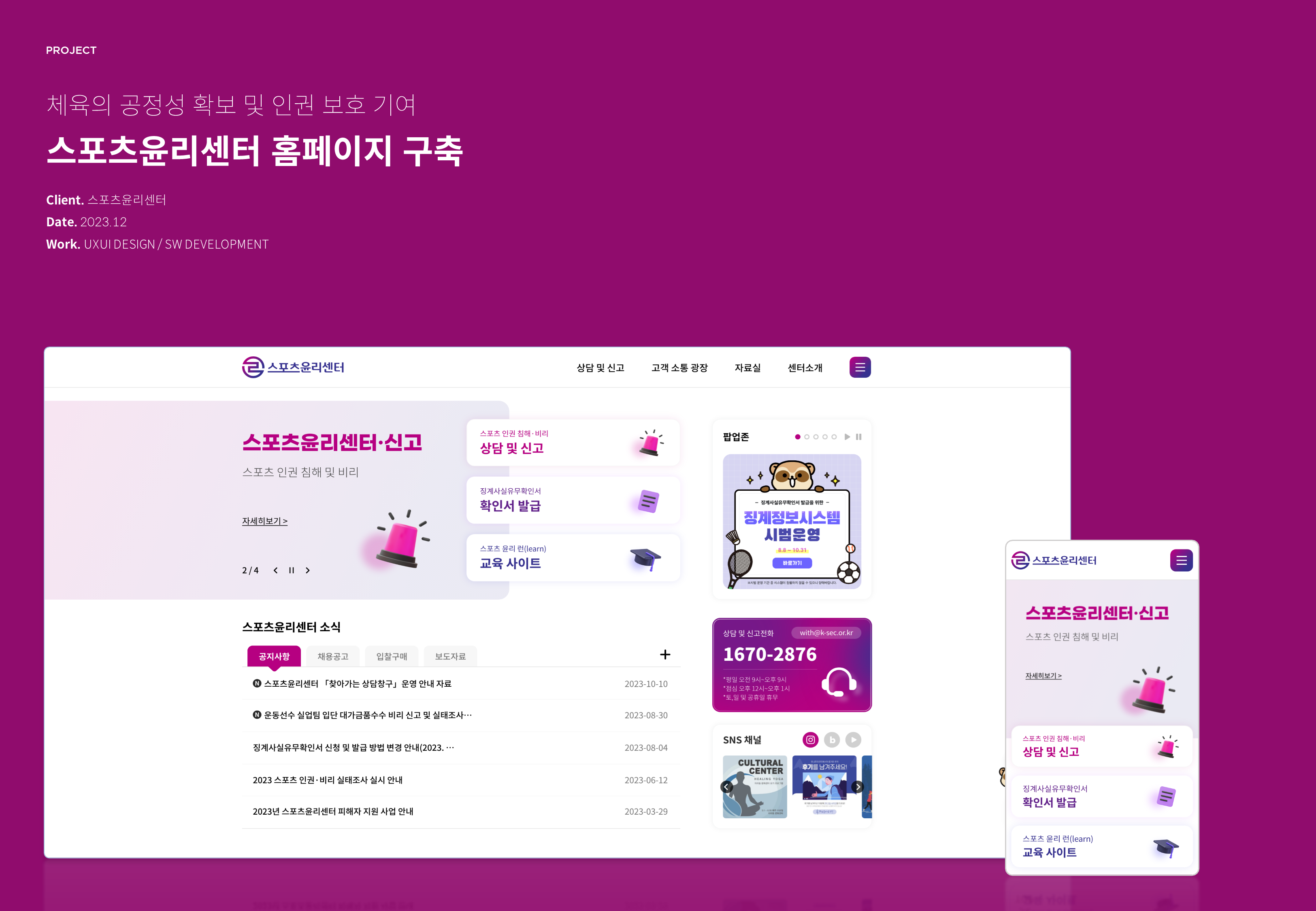 스포츠윤리센터 홈페이지 구축 페이지 정보 작성자 최고관리자 댓글 0건 조회 23회 작성일 25-11-14 15:51 목록 본문 스크랩 체육의 공정성 확보 및 인권 보호 기여 스포츠윤리센터 홈페이지를 구축하였습니다. 추천15 이전글#E65B2C 25.11.14 다음글#015CCE 25.11.14
