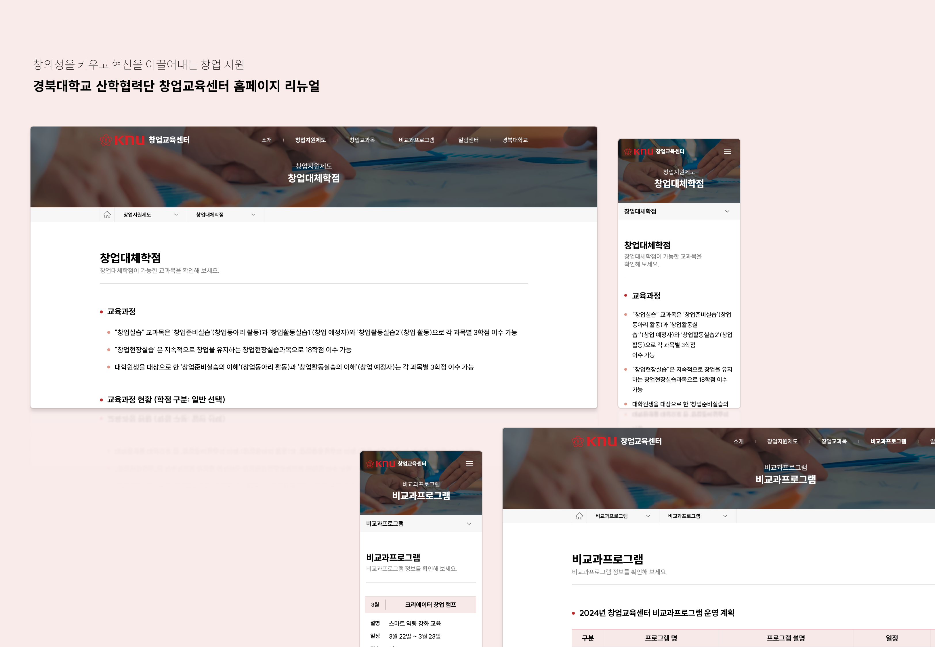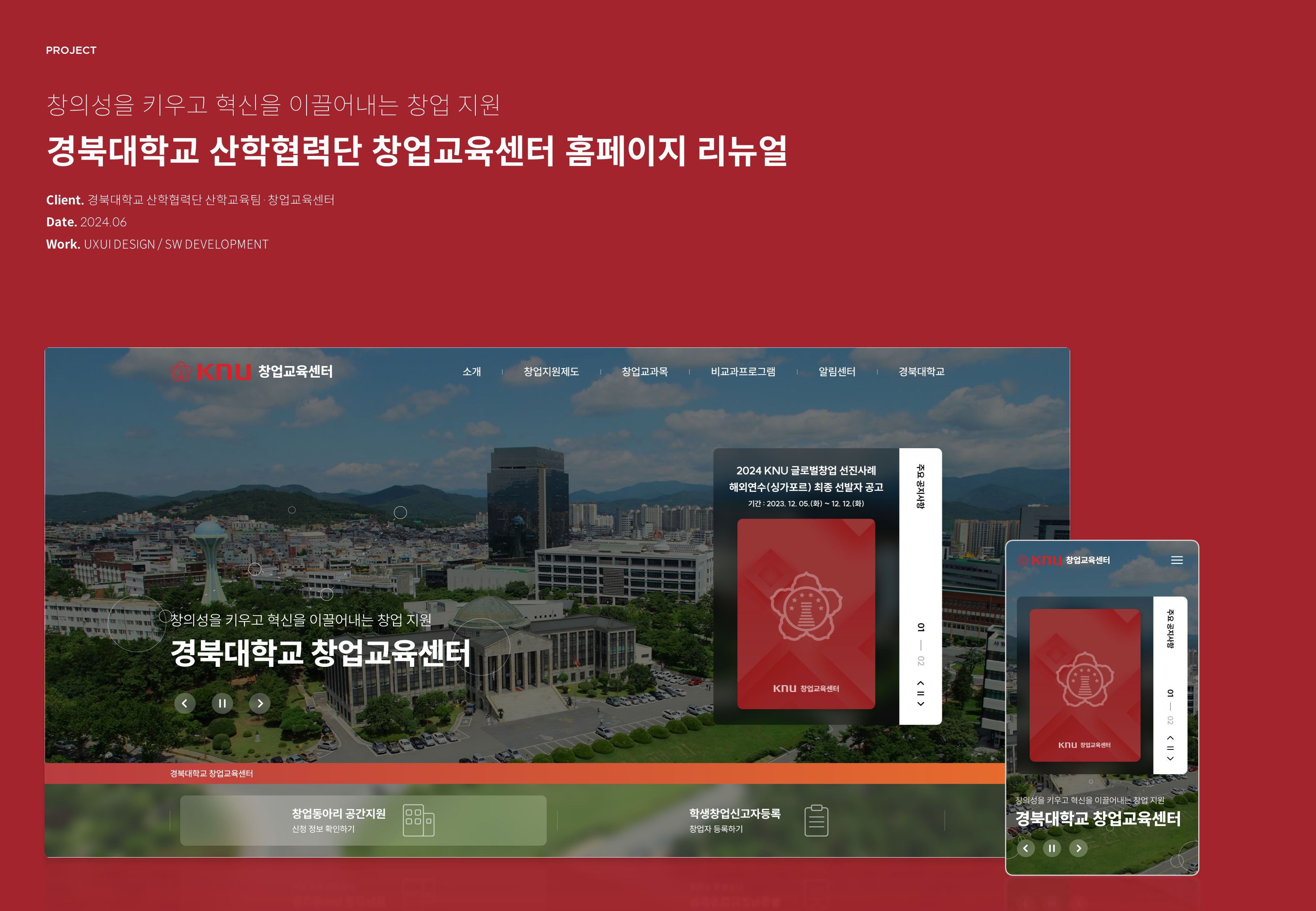 경북대학교 산학협력단 창업교육센터 홈페이지 리뉴얼 페이지 정보 작성자 최고관리자 댓글 0건 조회 47회 작성일 25-11-17 09:59 목록 본문 스크랩 창의성을 키우고 혁신을 이끌어내는 창업 지원 경북대학교 산학협력단 창업교육센터 홈페이지를 리뉴얼하였습니다. 추천15 이전글#A7292A 25.11.17 다음글#2DB1A7 25.11.17